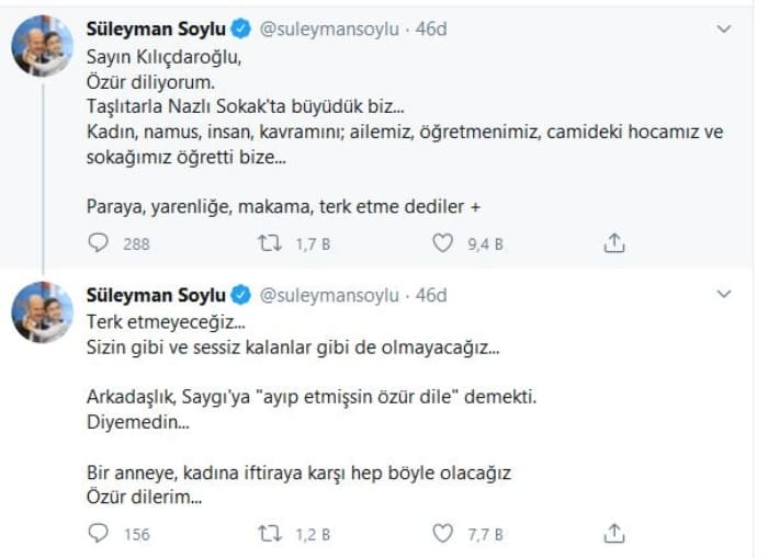 "Sayın Kılıçdaroğlu, Özür diliyorum. Taşlıtarla Nazlı Sokak'ta büyüdük biz... Kadın, namus, insan, kavramını; ailemiz, öğretmenimiz, camideki hocamız ve sokağımız öğretti bize...