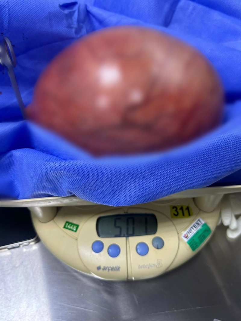 Kentte yaşayan 45 yaşındaki M.U., karın ağrısı şikayetiyle Kanuni Eğitim ve Araştırma Hastanesi Numune Kampüsü'ne gitti. Hastanedeki tetkiklerde kadının rahminden başlayıp göğüs altına kadar uzanan bir kitle tespit edildi.