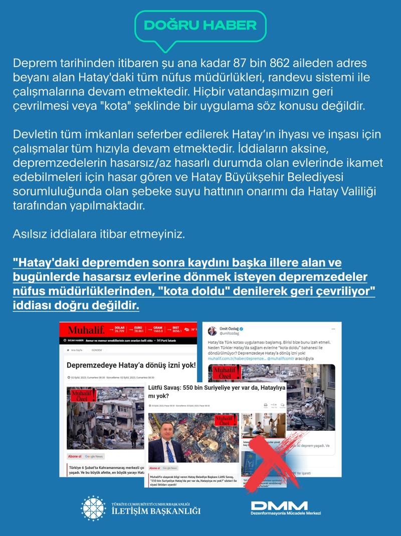 Yapılan açıklamada, "Hatay'daki depremden sonra kaydını başka illere alan ve bugünlerde hasarsız evlerine dönmek isteyen depremzedeler nüfus müdürlüklerinden, "kota doldu" denilerek geri çevriliyor" iddiası doğru değildir" denildi.