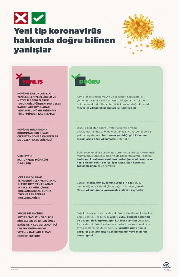 DOĞRU: Belirlenen kurallara uyulması durumunda, virüsten korunmak mümkündür. Özellikle olası ya da kesin tanı almış kişilerde, izolasyon kurallarına uyulması, hastalığın yayılmasında ve hasta kişinin yakın çevresi için hastalıktan korunma sağlanmasında çok önemlidir.