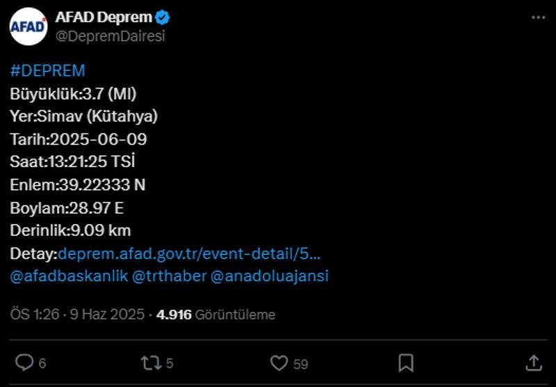 AFAD'ın son verilerine göre Kütahya'nın Simav ilçesinde saat 13.21'de 9.09 kilometre derinliğinde bir deprem meydana geldi.