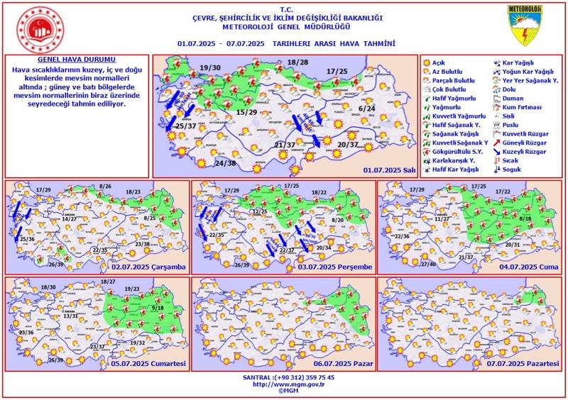 Meteoroloji temmuz ayının ilk gününe ilişkin yeni raporunu da yayımlarken, aralarında İstanbul'un da yer aldığı çok sayıda il için sağanak yağış uyarısında bulundu. Buna karşın iç ve doğu kesimlerde ortalama sıcaklık değerleri yer yer 6 dereceye kadar artış gösterecek.