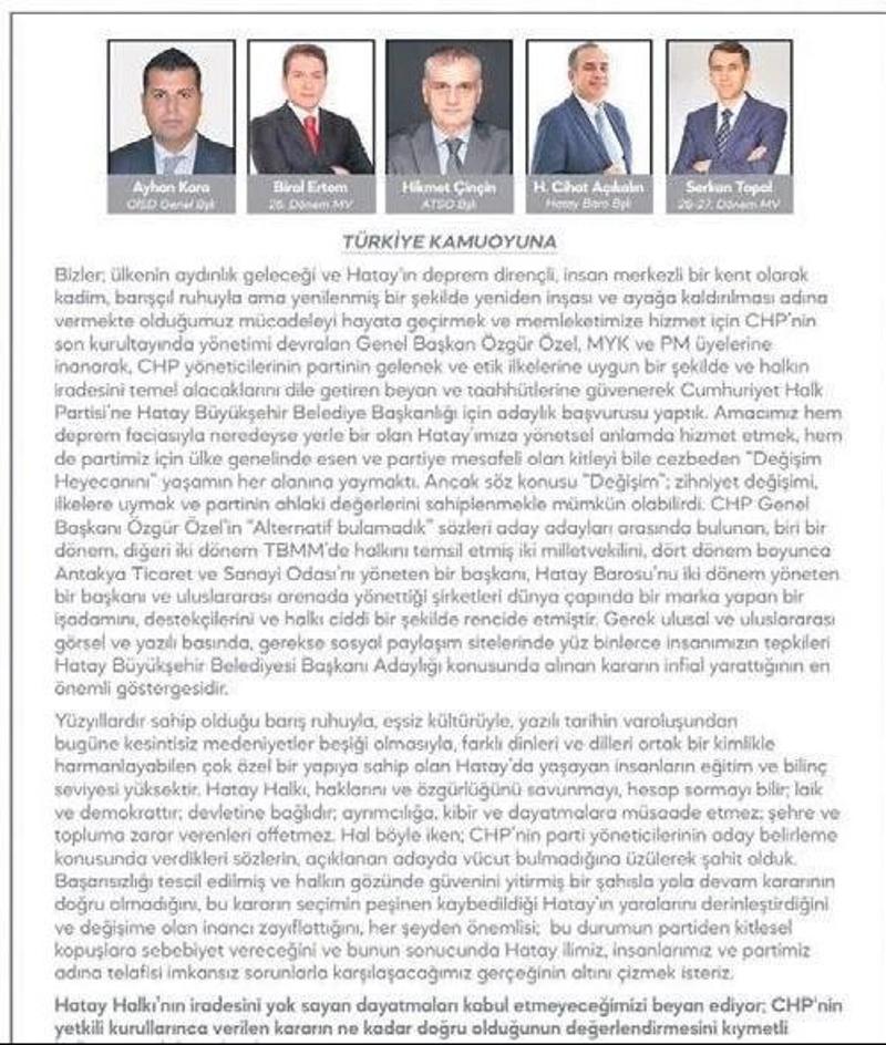 Partinin Hatay'daki aday adayları Ayhan Kara, Birol Ertem, Hikmet Çinçin, Cihat Açıkalın ve Serkan Topal ortak bir bildiri yayınlayarak, "Hatay halkının iradesini yok sayan dayatmaları kabul etmeyeceğimizi beyan ediyor; CHP'nin yetkili kurullarınca verilen kararın ne kadar doğru olduğunun değerlendirmesini kıymetli halkımızın takdirine bırakıyoruz" dediler.Özgür Özel'in Hatay Büyükşehir Belediye Başkan adaylığı için "Alternatif bulamadık" sözlerinin de eleştirildiği zehir zemberek bildiride, CHP'nin parti yöneticilerinin aday belirleme konusunda verdikleri sözlerin, açıklanan adayda vücut bulmadığına yer verildi. Mevcut başkanın başarısızlığının "tescil edildiğine" yer verilen açıklamada, "Başarısızlığı tescil edilmiş ve halkın gözünde güvenini yitirmiş bir şahısla yola devam kararının doğru olmadığını, bu kararın seçimin peşinen kaybedildiği Hatay'ın yaralarını derinleştirdiğini ve değişime olan inancı zayıflattığını, her şeyden önemlisi; bu durumun partiden kitlesel kopuşlara sebebiyet vereceğini ve bunun sonucunda Hatay ilimiz, insanlarımız ve partimiz adına telafisi imkânsız sorunlarla karşılaşacağımız gerçeğinin altını çizmek isteriz" ifadeleri yer aldı.