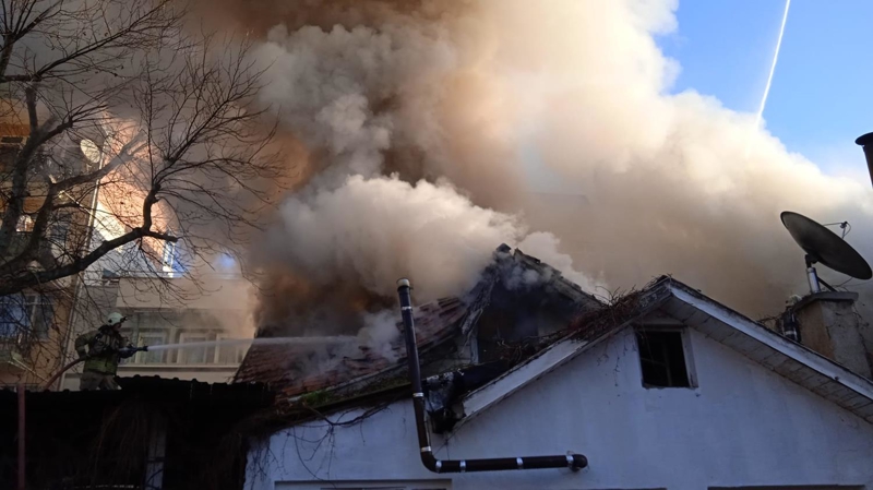 İtfaiye ekiplerinin yangına müdahale ettiği sırada binanın çatısında çökme meydana geldi.