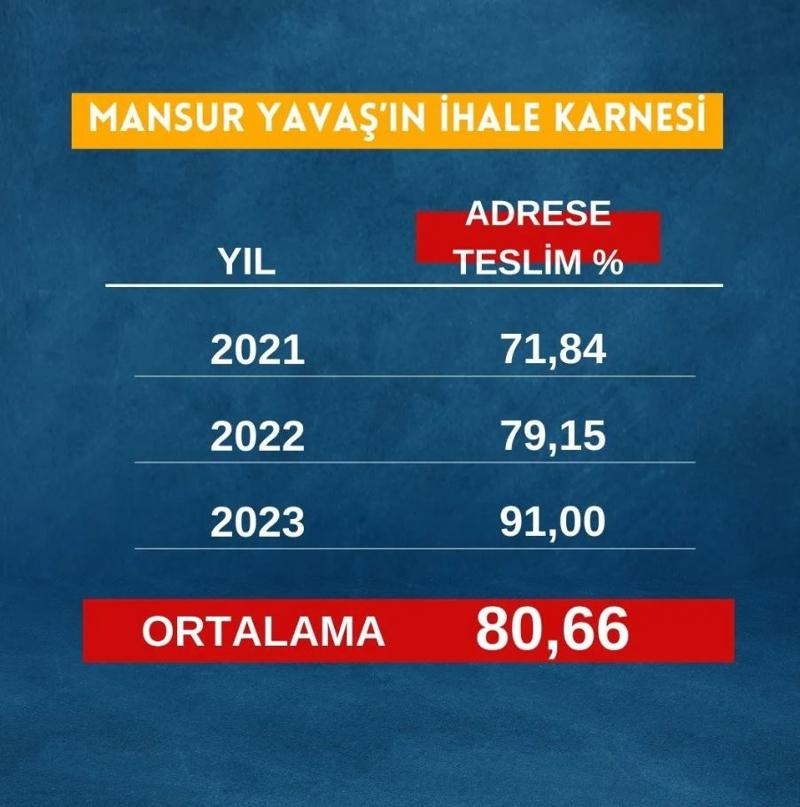 Cumhuriyet Halk Partili Ankara Büyükşehir Belediye Başkanı Mansur Yavaş, 2019'dan bu yana başkente tek bir eser kazandırmadı. Sosyal medyadan sayısız algı operasyonuna imza attı. İhaleleri canlı yayınlanacağını söyledi hatta bazı ihaleleri canlı olarak yayınlayarak iyi bir göz boyamaya çalıştı. Ancak yerel seçime 6 gün kala, Yavaş'ın ihale karnesi gerçeği ortaya çıkardı. 2021- 2022 ve 2023 Mali Yılı Denetim Komisyonu verilerine göre Yavaş'ın "adrese teslim" yani doğrudan temin yoluyla yaptığı ihalelerin ortalaması yüzde 80,66 çıktı.