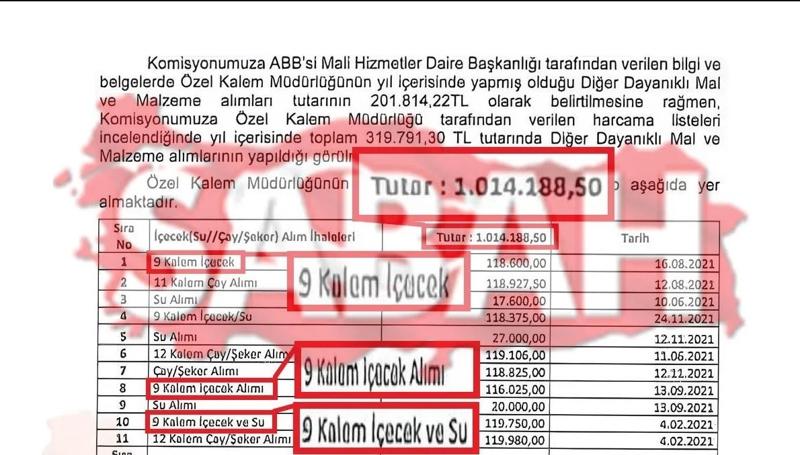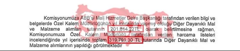 Sabah'ın haberine göre, Diğer taraftan komisyon raporundaki rakamların tutarsızlığı dikkat çekti. Mali Hizmetler Daire Başkanlığı tarafından hazırlanan raporda, Özel Kalem Müdürlüğü'nün Dayanıklı Mal ve Malzeme Alımları tutarının 201 bin 814 TL olduğu belirtildi.