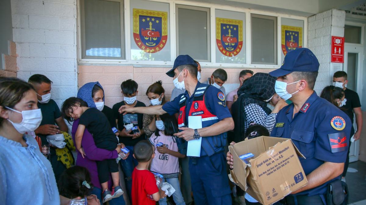 Burada bebek ve çocukların araçlardan inmesine yardımcı olan jandarma ekipleri, düzensiz göçmenlerin su ve yemek ihtiyacını karşıladı.