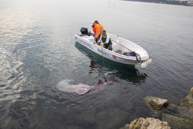 Büyükşehir Belediyesi Çevre Koruma ve Kontrol Dairesince vinç yardımıyla denizden çıkarılan köpek balığının gömüleceği öğrenildi.