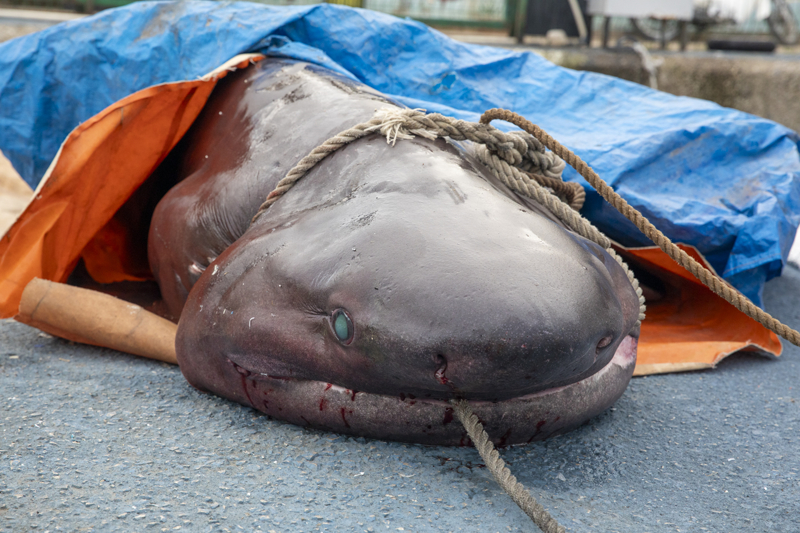 İhbar üzerine bölgeye yönlendirilen ekipler, halk arasında "boz camgöz" olarak da bilinen altı solungaçlı köpek balığının öldüğünü belirledi.