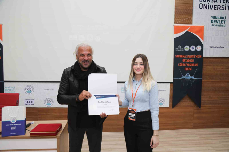 Güvenlik Politikaları Uzmanı Mete Yarar, Bursa Teknik Üniversitesi'nde "Savunma Sanayii'mizin Ortadoğu Coğrafyasındaki Etklileri" konulu konferans verdi. Çok sayıda akademisyenin, sivil toplum kuruluşu temsilcisinin ve öğrencilerin katıldığı programın başında milli muharip uçağı Kaan'ın tanıtım videosunun gösterime sunuldu.