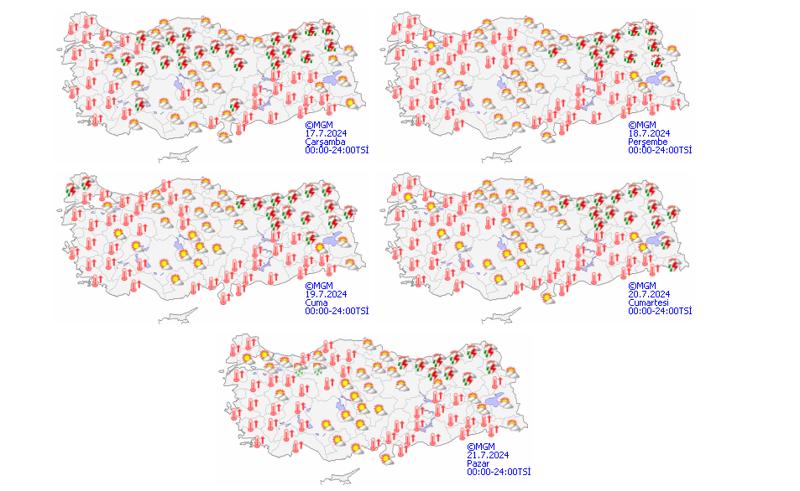 Meteoroloji Genel Müdürlüğünden alınan tahminlere göre, yurdun genelinin parçalı yer yer çok bulutlu, Marmara'nın güneydoğusu, Akdeniz'in iç kesimleri, İç Anadolu'nun kuzeyi, Karadeniz'in iç kesimleri, Doğu Anadolu'nun kuzeyi ile Afyonkarahisar çevrelerinin yerel sağanak ve gök gürültülü sağanak yağışlı geçeceği tahmin ediliyor.