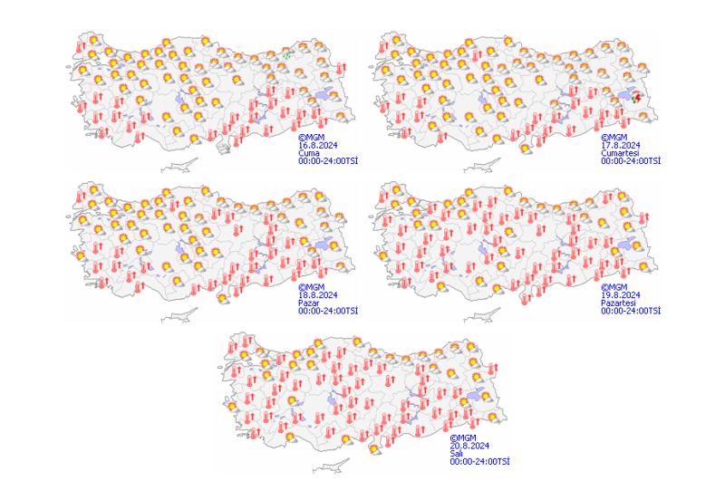 Yapılan son değerlendirmelere göre, yurdun kuzeydoğu kesimlerinin parçalı, yer yer çok bulutlu, Trabzon, Giresun, Ordu ve Samsun illerinin iç kesimleri, Rize çevreleri ile Hatay'ın kıyı kesimlerinin yerel sağanak yağışlı, Van'ın doğu kesimlerinin yerel olmak üzere gök gürültülü sağanak yağışlı, diğer yerlerin az bulutlu ve açık geçeceği tahmin ediliyor.