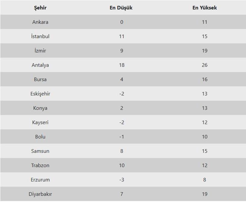 Önümüzdeki hafta başından itibaren bazı illerde gerçekleşmesi beklenen günün en düşük ve en yüksek hava sıcaklıklarının aşağıdaki değerlere düşmesi bekleniyor.