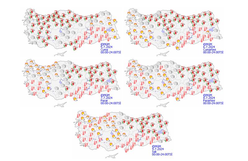 Meteoroloji Genel Müdürlüğü tahminlerine göre, yurdun kuzey, iç ve batı kesimlerinin parçalı, yer yer çok bulutlu, Marmara (Çanakkale haric), Ege (İzmir ve Aydın haric), Batı Akdeniz, İç Anadolu'nun kuzey ve batısı, Batı ve Orta Karadeniz, Doğu Karadeniz kıyıları ile Mersin, Adana, Osmaniye, K. Maraş'ın batısı, Hatay kıyıları ve Yozgat çevrelerinin yerel olmak üzere sağanak ve gök gürültülü sağanak yağışlı, diğer yerlerin az bulutlu ve açık geçeceği tahmin ediliyor.