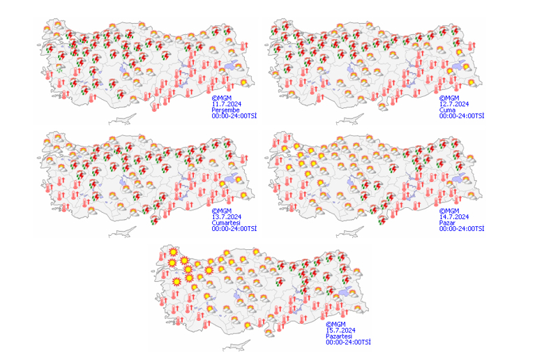 Yurdun kuzey, iç ve batı kesimlerinin parçalı, yer yer çok bulutlu, Marmara'nın güney ve doğusu, İç Ege, Akdeniz'in iç kesimleri, İç Anadolu'nun kuzey ve batısı, Karadeniz'in iç kesimleri ile Rize, Ardahan, Kars çevreleri ve Trabzon'un doğu ilçelerinin yerel sağanak ve gök gürültülü sağanak yağışlı, diğer yerlerin az bulutlu ve açık geçeceği tahmin ediliyor. Yağışların Kastamonu, Çorum, Çankırı, İstanbul çevreleri ile Kırıkkale'nin kuzey kesimleri ve Ankara'nın kuzey ve doğusunda yerel kuvvetli olması bekleniyor.