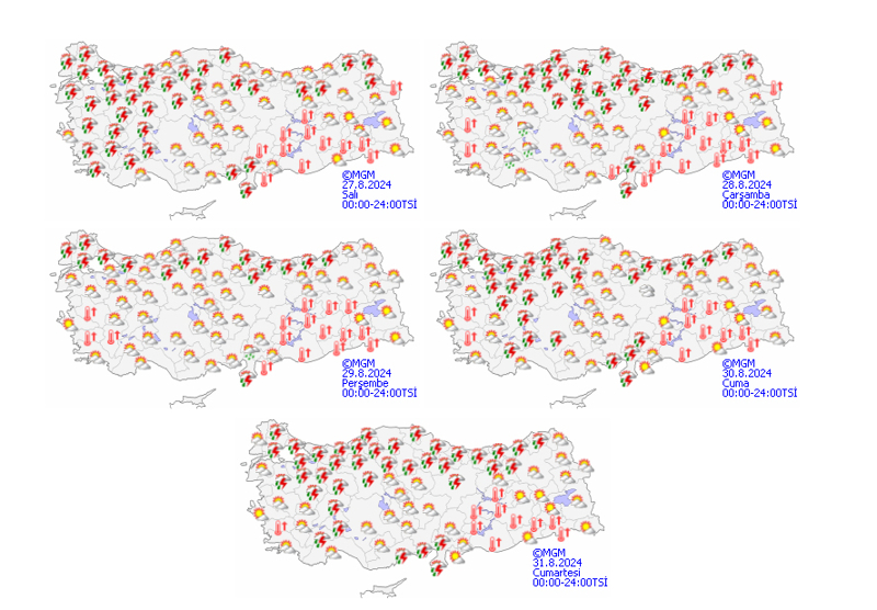 Meteoroloji Genel Müdürlüğünden alınan tahminlere göre, ülkemizin kuzeyi ile zamanla güney ve batı kesimlerinin parçalı, yer yer çok bulutlu, Marmara, İç Ege, Akdeniz'in iç kesimleri ve İskenderun Körfezi çevreleri, İç Anadolu'nun kuzeybatı ve güney kesimleri, Karadeniz'in iç kesimleri ile Düzce, Sinop, Samsun, Kars ve Ardahan çevrelerinin yerel sağanak ve gök gürültülü sağanak yağışlı geçeceği tahmin ediliyor. Yağışların Kocaeli'nin kuzey kesimleri ile İstanbul'da yer yer kuvvetli olması bekleniyor.