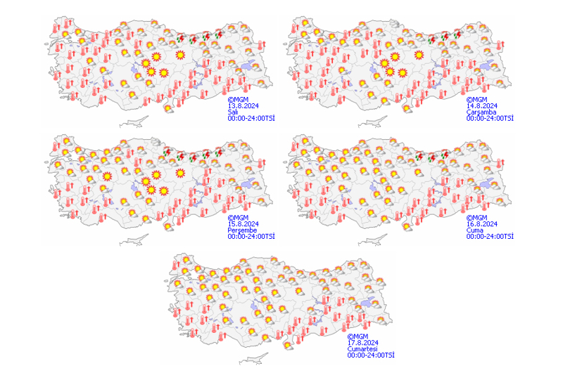 Meteoroloji Genel Müdürlüğünden alınan tahminlere göre, ülkemizin kuzeydoğu kesimleri parçalı ve çok bulutlu, (Samsun hariç) Orta ve Doğu Karadeniz kıyıları ile Ağrı'nın doğusu ve Van'ın güney ve doğu çevrelerinin yerel sağanak ve gök gürültülü sağanak yağışlı, diğer yerlerin az bulutlu ve açık geçeceği tahmin ediliyor.