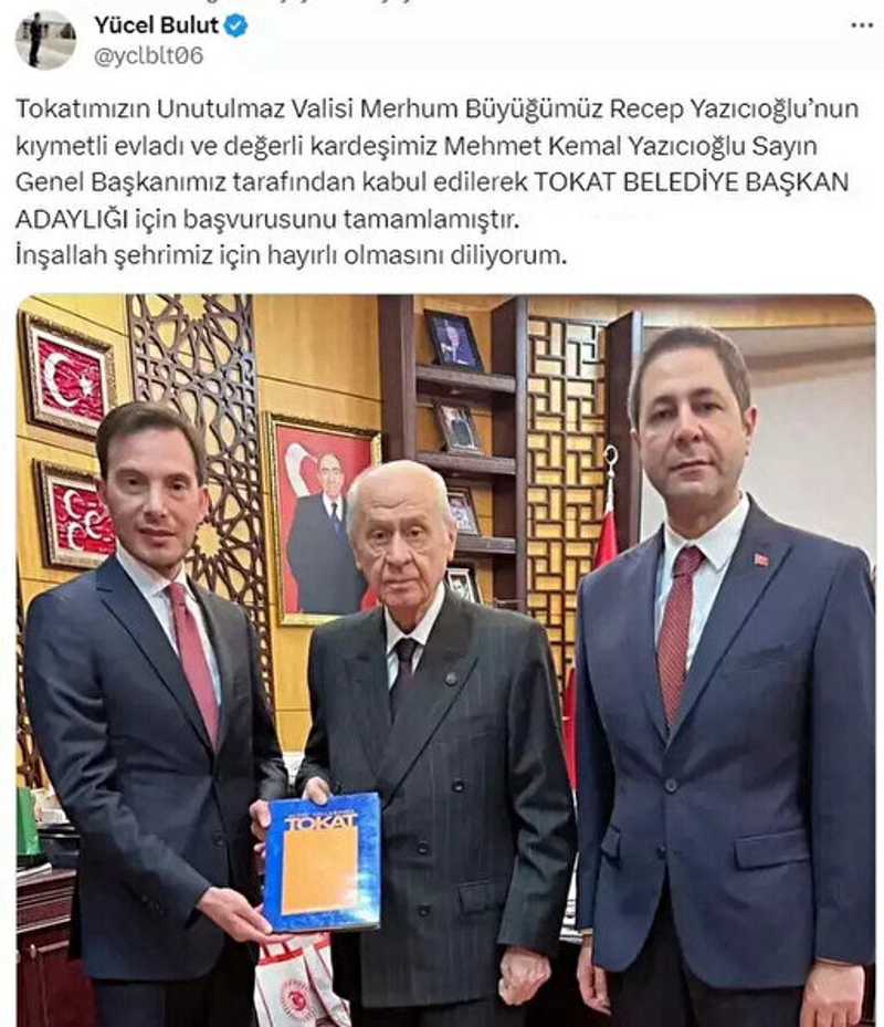 Yücel, paylaşımında "Tokatımızın Unutulmaz Valisi Merhum Büyüğümüz Recep Yazıcıoğlu'nun kıymetli evladı ve değerli kardeşimiz Mehmet Kemal Yazıcıoğlu Sayın Genel Başkanımız tarafından kabul edilerek TOKAT BELEDİYE BAŞKAN ADAYLIĞI için başvurusunu tamamlamıştır. İnşallah şehrimiz için hayırlı olmasını diliyorum." ifadelerine yer verdi.