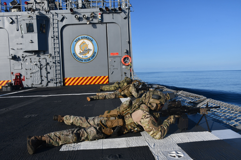 "TCG Gökova, TCG Gediz ve TCG Üsteğmen Arif Ekmekçi'den oluşan 'Somali Deniz Görev Grubu' unsurları tarafından 'Acil Sıhhi Tahliye ve Atış Eğitimleri', 'Helikopterden Makineli Tüfek/Hafif Silah Atışları' gerçekleştirildi. TCG Üsteğmen Arif Ekmekçi'de bulunan ATAK bot ve helikopter ile de 'Koordineli Suüstü Harekatı Eğitimi' yapıldı."