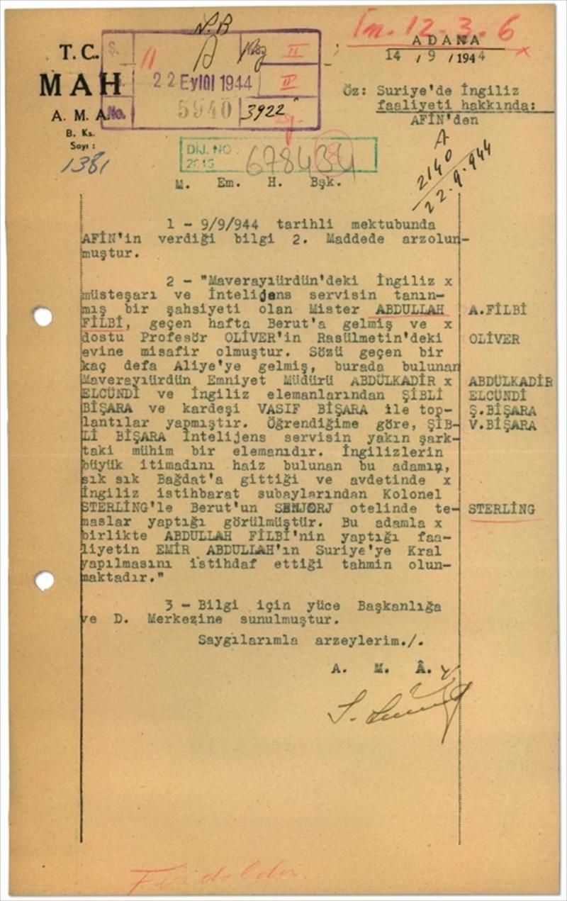 "Maverayıürdün'deki İngiliz müsteşarı ve İntelijans servisin tanınmış bir şahsiyeti olan Mister Abdullah Filbi, geçen hafta Berut'a ve dostu Profesör Oliver'in Rasülmetin'deki evine misafir olmuştur. Sözü geçen bir kaç defa Aliye'ye gelmiş, burada bulunan Maverayıürdün Emniyet Müdürü Abdülkadir Elcündi ve İngiliz elemanlarından Şibli Bişara ve kardeşi Vasıf Bişara ile toplantılar yapmıştır. Öğrendiğime göre, Şibli Bişara İntelijens servisin yakın şarktaki mühim bir elemanıdır. İngilizlerin büyük itimadını haiz bulunan bu adamın, sık sık Bağdat'a gittiği ve avdetinde İngiliz istihbarat subaylarından Kolonel Sterling'le Berut'un Senjorj otelinde temaslar yaptığı görülmüştür. Bu adamla birlikte Abdullah Filbi'nin yaptığı faaliyetin Emir Abdullah'ın Suriye'ye Kral yapılmasını istihdaf ettiği tahmin olunmaktadır. Bilgi için yüce Başkanlığa ve D. Merkezine sunulmuştur."
