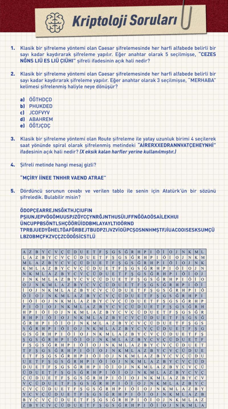 ŞİFRELİ ATATÜRK SORUSUSorular arasında Türkiye Cumhuriyeti'nin Kurucusu Gazi Mustafa Kemal Atatürk'ün sözünün şifrelenmiş hali de yer aldı. Atatürk'ün şifrelenmiş sözleri, Vigenere şifreleme aşamaları takip edilerek, şu şekilde çözüldü: