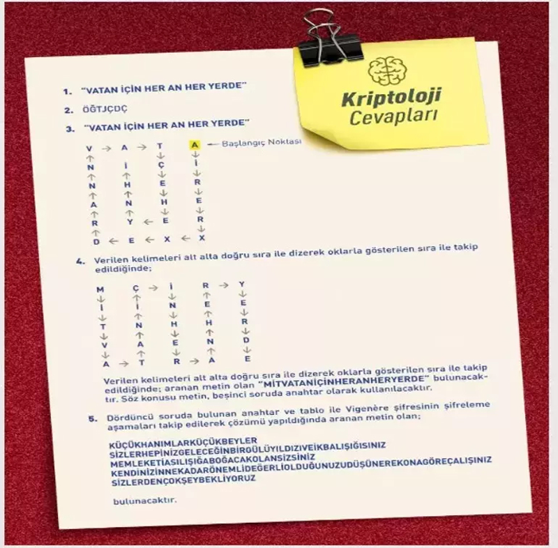 Diğer bir soruda şifreli metinde gizlenen mesaj, "MİT vatan için her an her yerde" oldu.