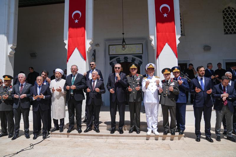 İstanbul İl Müftüsü Safi Arpaguş'un dua etmesinin ardından Cumhurbaşkanı Erdoğan ve beraberindekiler Milli Savunma Üniversitesi Rektörlük Camisi'nin açılış kurdelesini kesti.