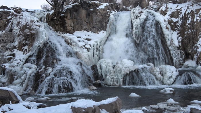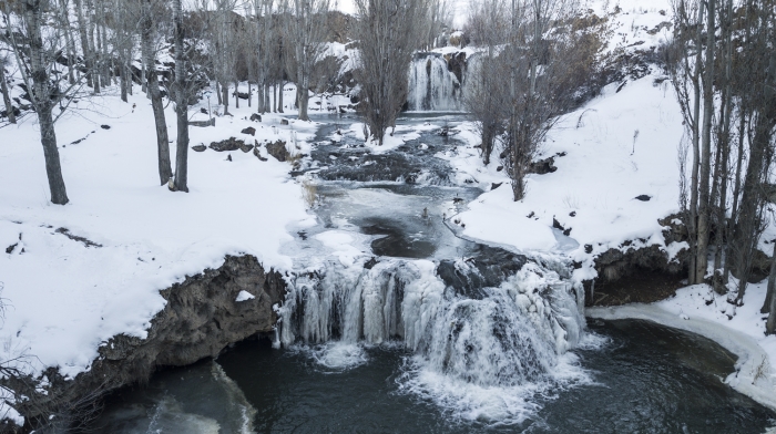 Hava sıcaklığının sıfırın altında 18 dereceye kadar düştüğü ilçede, Bendimahi Çayı üzerinde yaklaşık 20 metre yüksekten akan şelalenin bir kısmı, soğuk havanın etkisiyle buz tuttu.