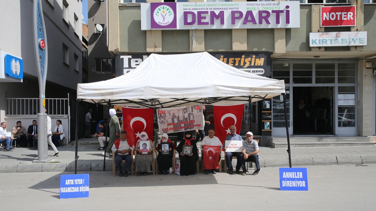 Çocuklarını terör örgütünden kurtarmak amacıyla her çarşamba günü DEM Parti İl Başkanlığı binası önünde bir araya gelen anne ve babalar, "Evlat nöbetindeyiz", "Anneler direniyor" ve "Artık yeter yakamızdan düşün" yazılı pankartlar" açtı.