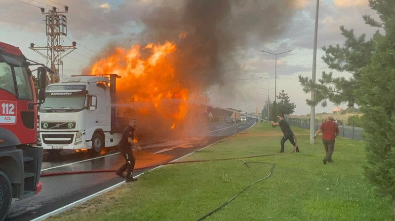 2000 Evler Mahallesi Zübeyde Hanım Caddesi'nde seyir halinde olan T.B. idaresindeki 03 HD 344 plakalı tırın plastik malzeme yüklü dorsesinde, üniversite kavşağı yakınlarında henüz bilinmeyen nedenle yangın çıktı.