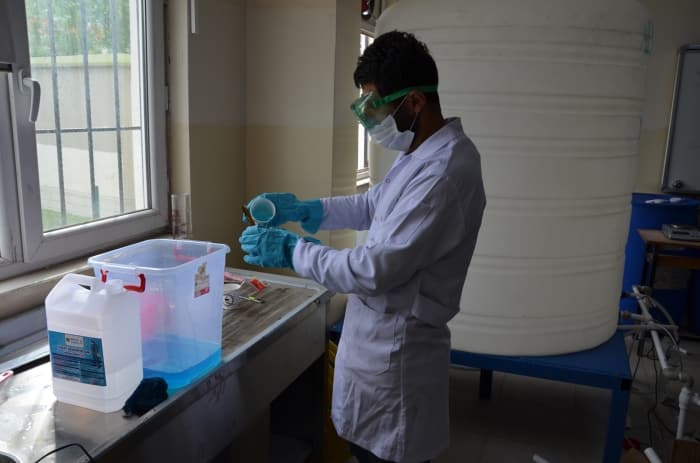 Mesleki ve Teknik Anadolu Lisesinde kimya öğretmenleri, okul bünyesindeki atölyede koronavirüs tedbirleri kapsamında dezenfekten üretimi yapıyor.