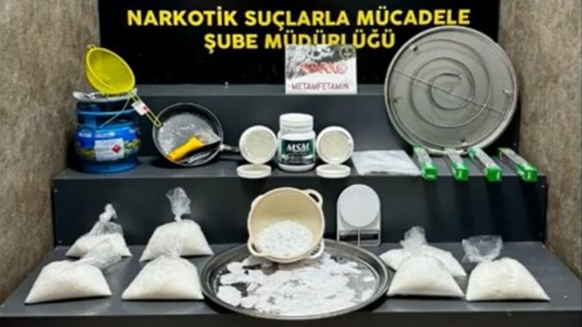 Otel odasında yapılan aramada 9 kilo 320 gram sentetik uyuşturucu ile uyuşturucu imalatında kullanılan malzemeler, hassas terazi, 2 tabanca, 15 fişek ele geçirildi.
