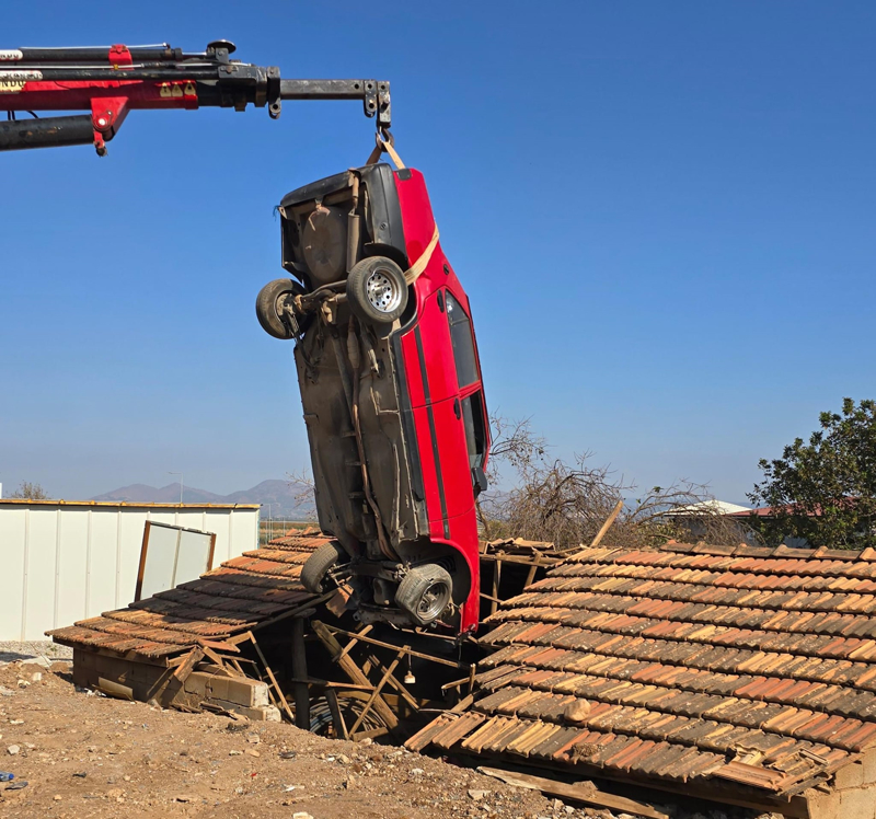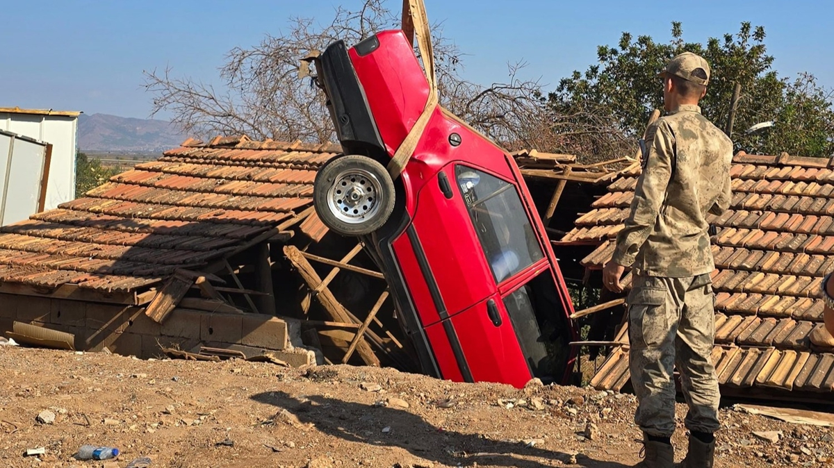 Otomobilde ve ahırın çatısında hasar meydana geldi.