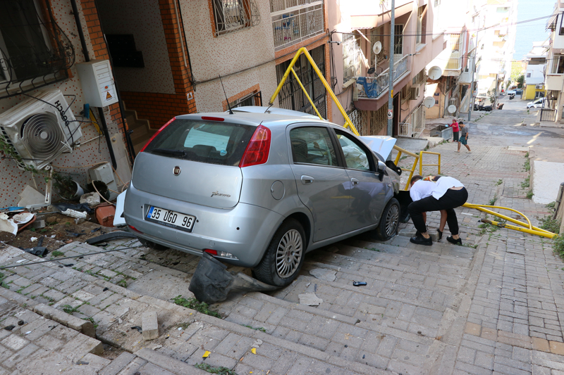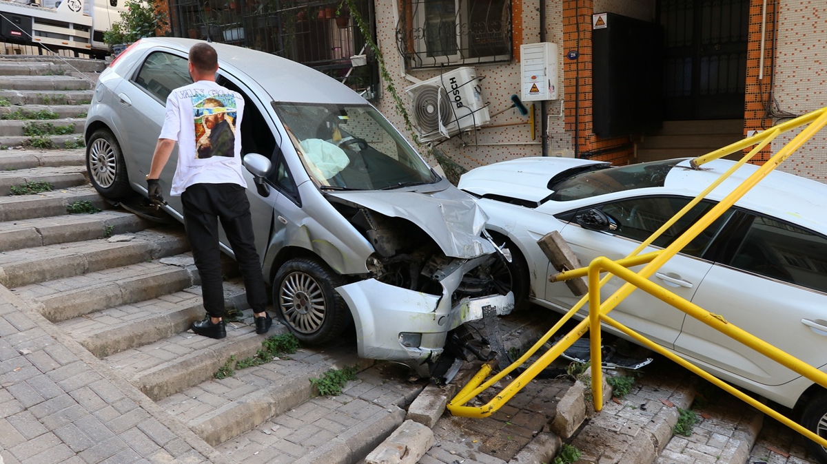 Çarpmanın etkisiyle iki otomobil de yol kenarındaki merdivenlere düştü.