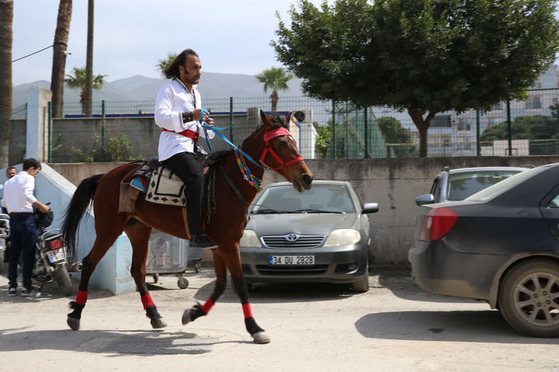 İskenderun'da vinç operatörlüğü yapan Abdullah Cıla (39), "Yörük Kızı" adlı atının üzerinde gittiği Denizciler Gübretaş Ortaokulu'nda oyunu kullandı.