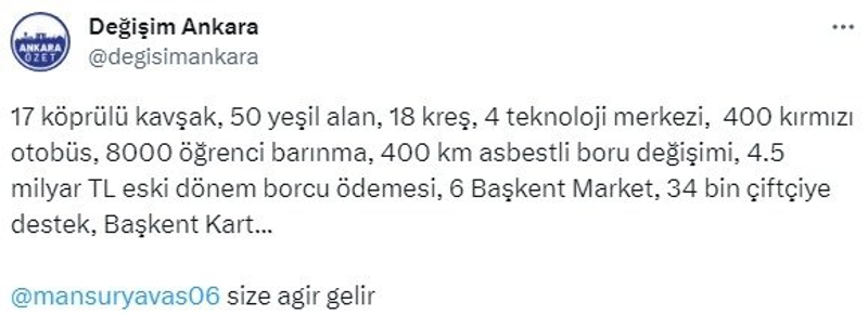 Değişim Ankara isimli bir hesap, yaptığı paylaşımda Yavaş'ın belediyeyi soktuğu borcu ve tabelasını değiştirerek "Biz yaptık" dediği kreş diğer projeleri görmezden gelerek "17 köprülü kavşak, 50 yeşil alan, 18 kreş, 4 teknoloji merkezi, 400 kırmızı otobüs, 8000 öğrenci barınma, 400 kilometre asbestli boru değişimi, 4.5 milyar TL eski dönem borcu ödemesi, 6 Başkent Market, 34 bin çiftçiye destek, Başkent Kart" şeklinde paylaşım yaptı.
