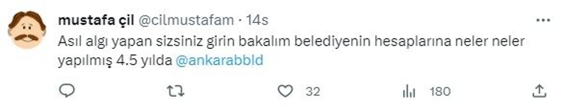 Mustafa Çil isimli bir başka hesap ise, "Asıl algı yapan sizsiniz girin bakalım belediyenin hesaplarına neler neler yapılmış 4.5 yılda" ifadelerini kullandı.