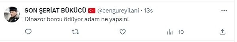 Son Şeriat Bükücü ise Yavaş'ın 4 buçuk yılda kaderine terk ederek Ankaralılara çürümesini seyrettirdiği Ankapark'ı görmezden gelerek, "Dinozor borcu ödüyor adam ne yapsın" şeklinde ilginç bir paylaşım yaptı.