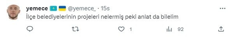 Yemece isimli bir bot hesap AK Parti Ankara İl Başkanı Hakan Han Özcan'ın AK Partili ilçe belediyelerinin yaptığı projeleri kalem kalem sıralamasına rağmen "İlçe belediyelerinin projeleri nelermiş peki anlat da bilelim" şeklinde paylaşım yaptı.