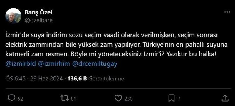 Bu durum, CHP Genel Başkanı Özgür Özel'in kardeşi Barış Özel'in bile tepkisine yol açtı. Tepkisini sosyal medyadan dile getiren Özel, İzmir Büyükşehir Belediye Başkanı Cemil Tugay'ın suya indirim sözünü seçim vaadi olarak verdiğini hatırlattı.