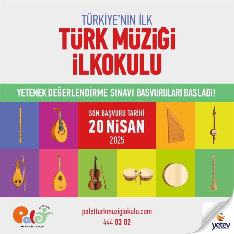 Türk Müziği temelli bir eğitim modeli uygulayarak geleceğin sanatçılarını yetiştiren Palet Türk Müziği İlkokulu, yeni öğrencilerini 21-26 Nisan arasında yapılacak 'Yetenek Değerlendirme Sınavı' ile kabul edecek. Yeni Türkiye Eğitim Vakfı (YETEV) çatısı altında eğitim veren okul, Türkiye'yi uluslararası ölçekte temsil edecek sanatçıların küçük yaşlarda yetiştirilmesi gerektiği vizyonuna yatırım yapıyor. Millî Eğitim Bakanlığı'nın ilkokul müfredatının tamamen uygulandığı okulda, ders programına özel olarak hazırlanan müzik branş dersleri ilave ediliyor. Bu sayede öğrenciler iyi bir akademik eğitimin yanı sıra sanatsal donanımlara sahip bir birey olarak yetişiyor.