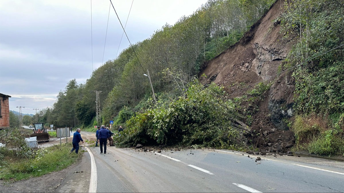 Karayolları ekipleri, iş makineleri yardımıyla yola sürüklenen toprak birikintisi ve ağaçları temizledi.