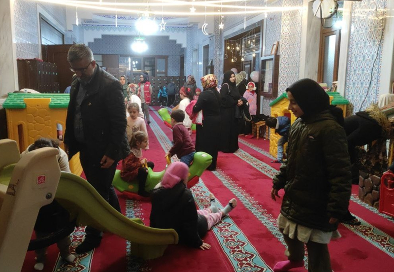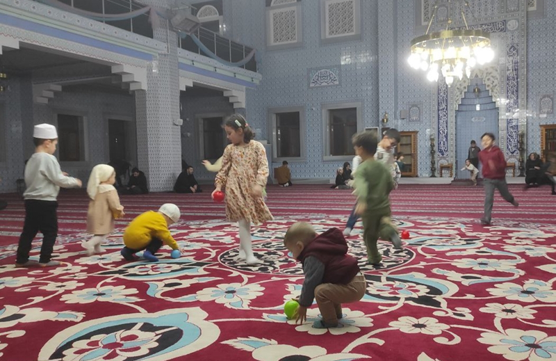 Aileleriyle camiye gelen küçük çocuklar teravih namazı öncesi avluda çocuk ilahileri dinledi, kendileri için hazırlanan alanda oynadı. Aileler, bu anları cep telefonlarıyla görüntüledi.