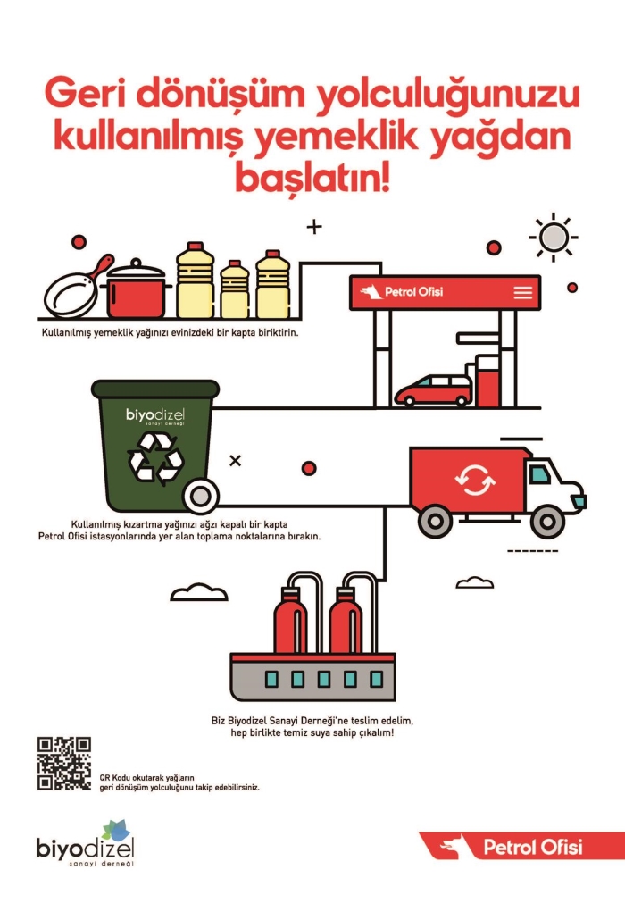 Petrol Ofisi'nin 31 istasyonunda başlatılan proje kapsamında yıllık yaklaşık 45 bin litre kullanılmış yemeklik yağın toplanması hedefleniyor. Petrol Ofisi ve Biyodizel Sanayi Derneği iş birliğiyle toplanan yağlarla, yaklaşık 2,2 milyon kişinin içme suyunun temiz kalması sağlanacak.