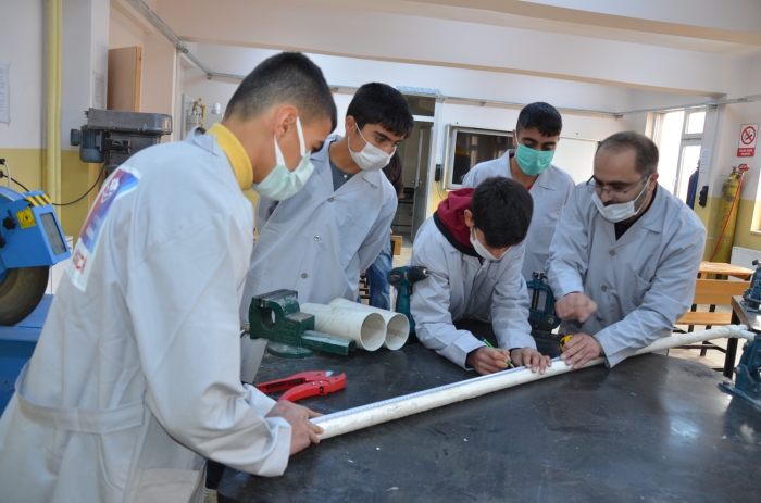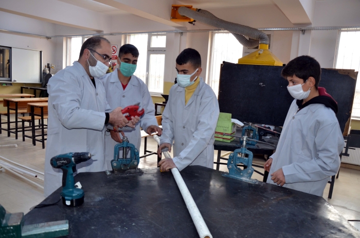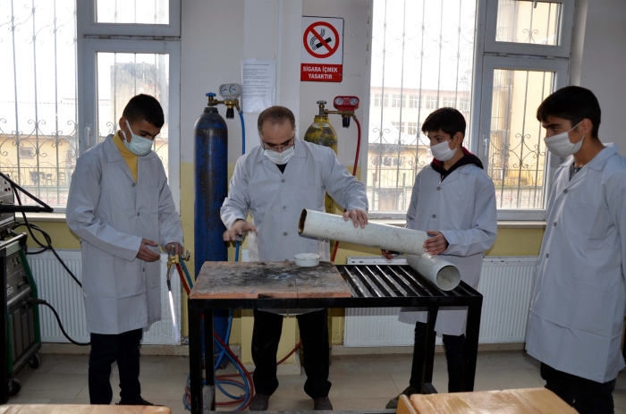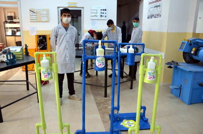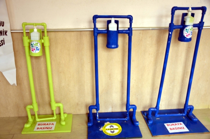 Okulun Tesisat Bölümü'nde görevli Ömer Örün ve öğrencileri, kullanılmayan su borularını değerlendirerek pedallı dezenfektan cihazı geliştirdi.