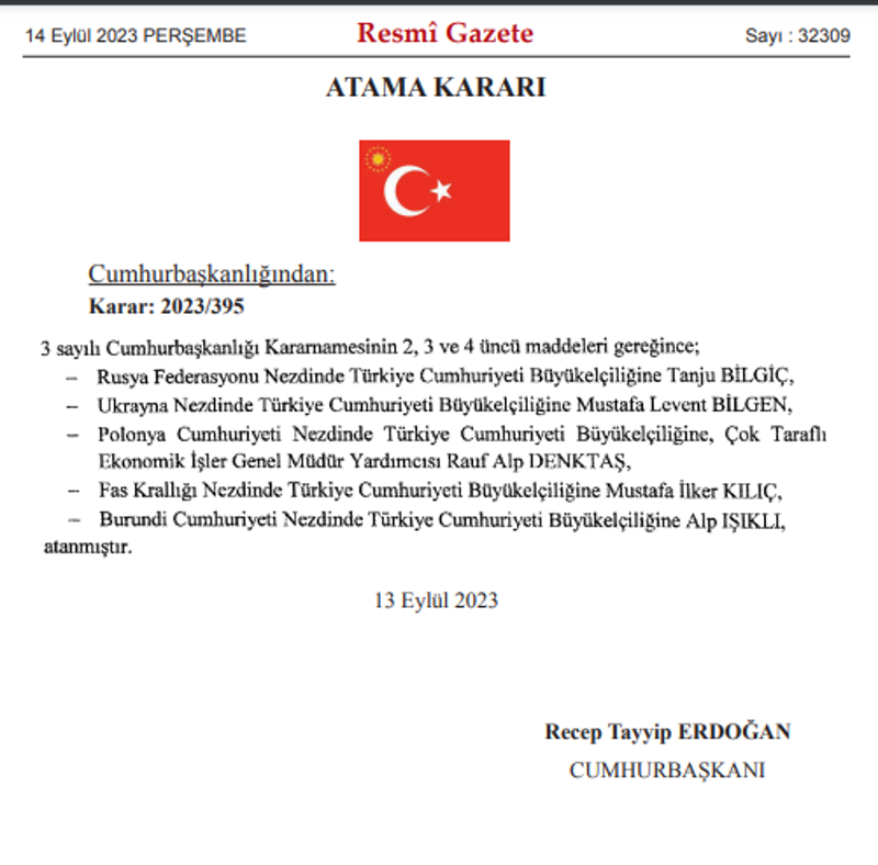 Karara göre, Türkiye'nin Moskova Büyükelçiliğine Tanju Bilgiç, Kiev Büyükelçiliğine Mustafa Levent Bilgen, Varşova Büyükelçiliğine Çok Taraflı Ekonomik İşler Genel Müdür Yardımcısı Rauf Alp Denktaş, Rabat Büyükelçiliğine Mustafa İlker Kılıç, Bujumbura Büyükelçiliğine Alp Işıklı atandı.