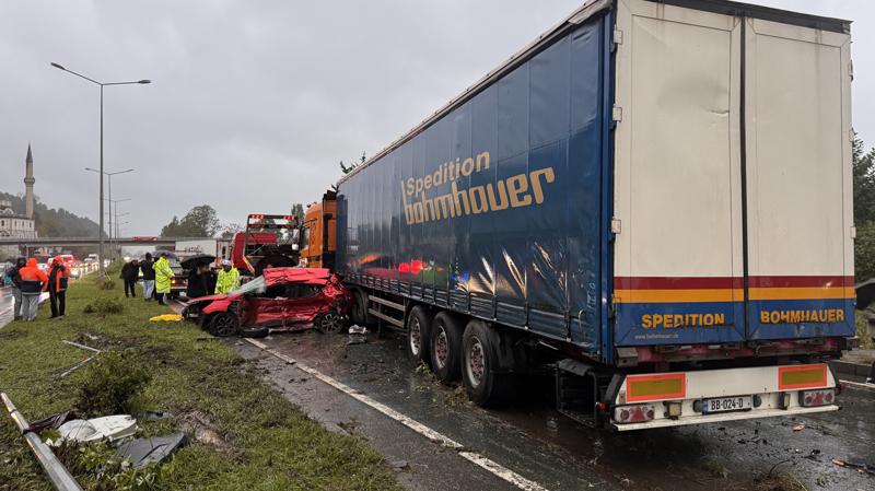 Otomobil, Rize yönüne giden D.M. idaresindeki HR-822-HH plakalı tıra çarptı.