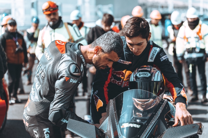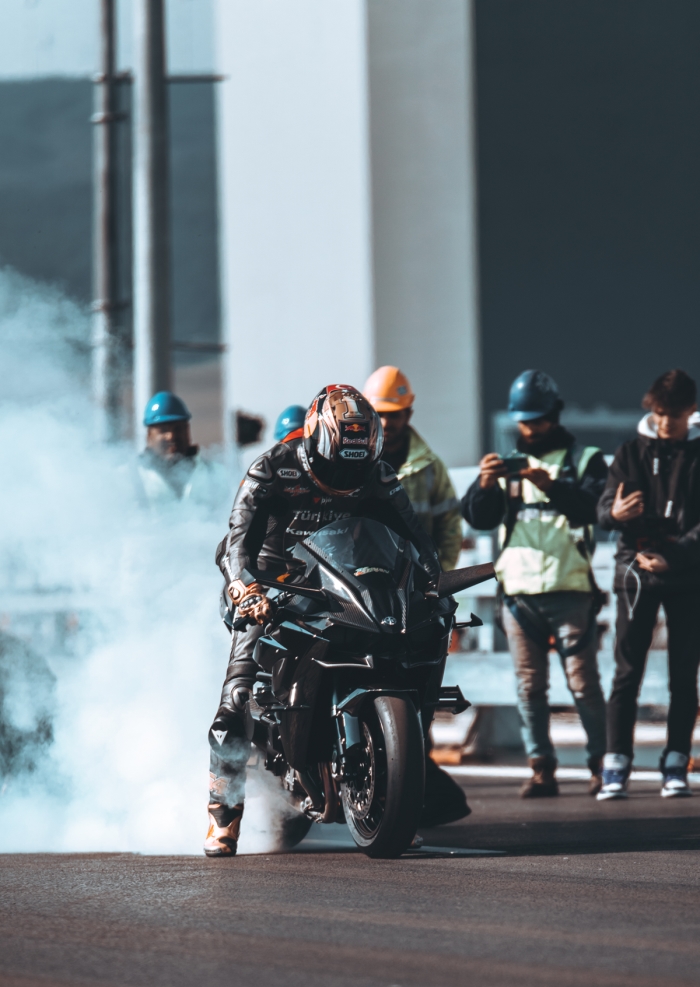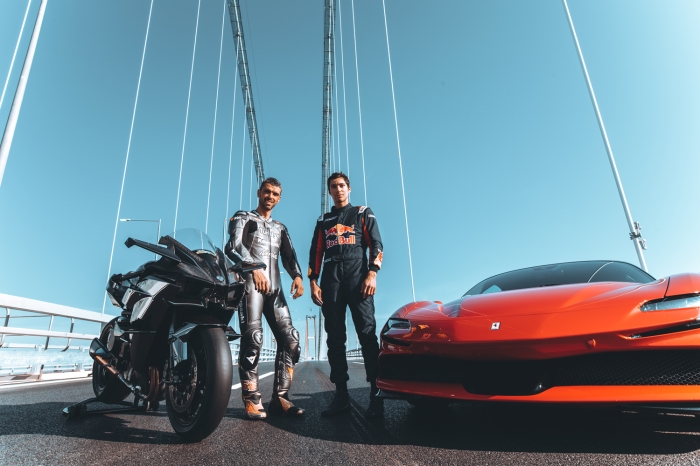 Sofuoğlu, Kawasaki tarafından "fabrikasyon yapılan dünyanın en hızlı motosikleti" HR2'ye binerken, Toprak ise Ferrari tarafından şu ana kadar yapılmış en hızlı araba SF90'ın direksiyonu başına geçti.