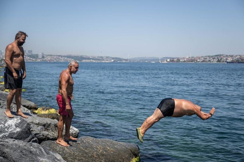 Büyükçekmece Sahili'ne yüzmeye gelenler yüksek sıcaklıktan şikayet etti.