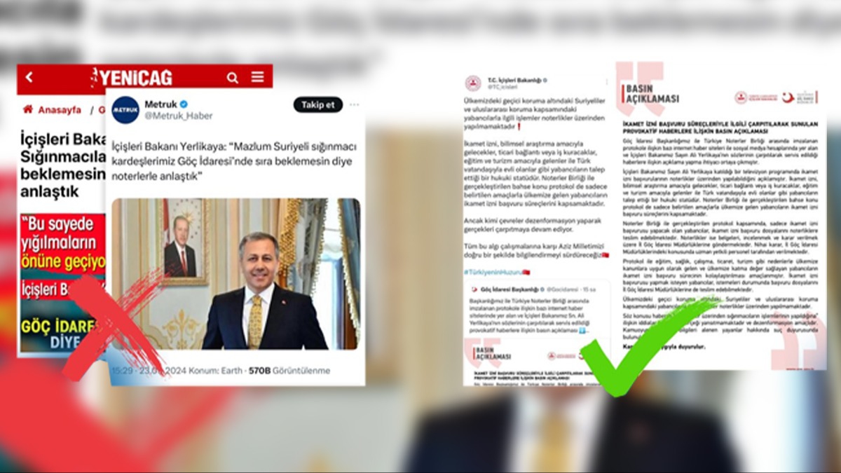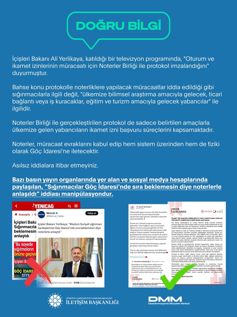 Protokolün sadece Türkiye'ye gelecek olan bilimsel araştırma, ticari bağlantı, eğitim ve turizm amaçlı olduğu belirtilen açıklamada, "Bazı basın yayın organlarında yer alan ve sosyal medya hesaplarında paylaşılan, "Sığınmacılar Göç İdaresi'nde sıra beklemesin diye noterlerle anlaşıldı" iddiası manipülasyondur. İçişleri Bakanı Ali Yerlikaya, katıldığı bir televizyon programında, "Oturum ve ikamet izinlerinin müracaatı için Noterler Birliği ile protokol imzalandığını" duyurmuştur. Bahse konu protokolle noterliklere yapılacak müracaatlar iddia edildiği gibi sığınmacılarla ilgili değil, "ülkemize bilimsel araştırma amacıyla gelecek, ticari bağlantı veya iş kuracaklar, eğitim ve turizm amacıyla gelecek yabancılar" ile ilgilidir." denildi.